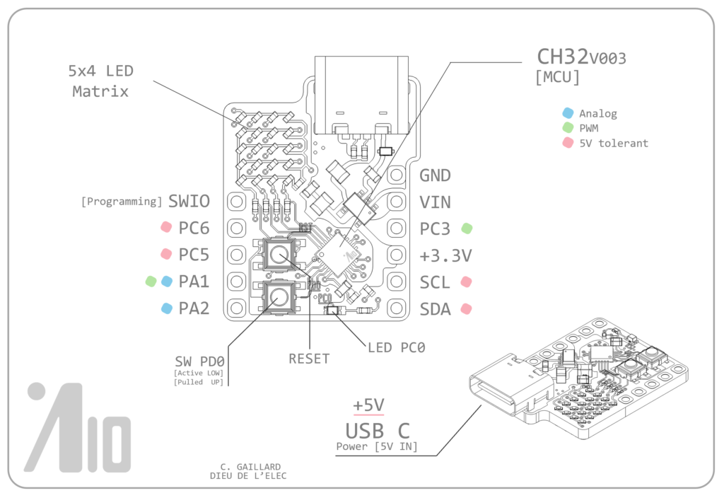 Вторая часть проекта – экспериментальная плата для микроконтроллера CH32V003 (RISC‑V, 26 KB флеш‑памяти, стоимость около 0,25 $). Плата также питается от USB‑C (работает при 3.3 V, выводы PC5/PC6 выдерживают 5 V). На её поверхности размещён 4 × 5 charlieplex‑массив светодиодов и встроенный 3.3 V LDO. Программирование осуществляется через SWIO‑интерфейс с использованием программатора WCH‑linkE.